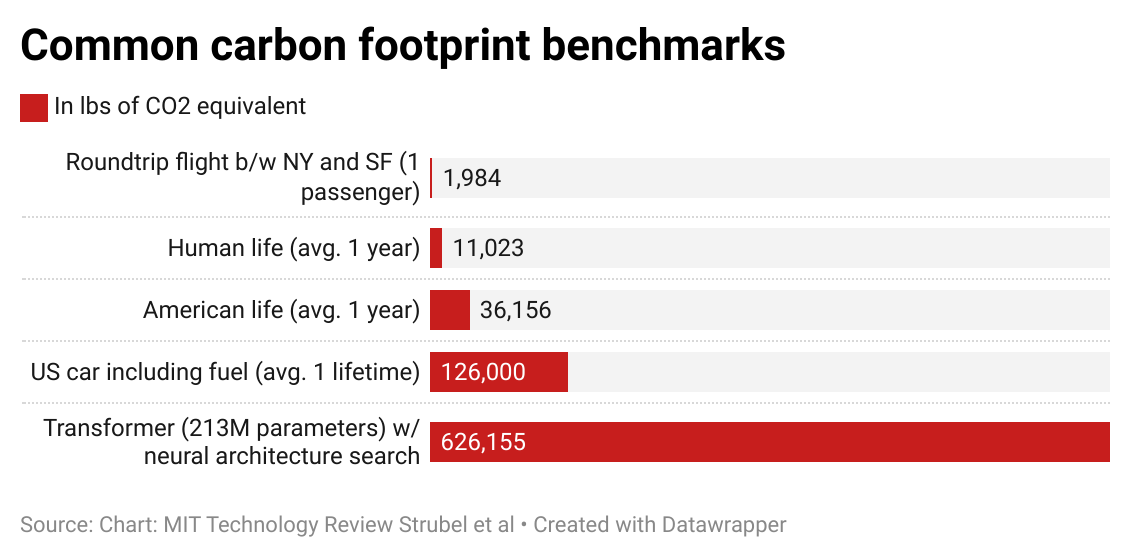 To quantify this alarming picture, MIT researchers found that training to achieve a 1% error rate would potentially cost more than US$100 quintillion (that’s not a typo, it’s \(100 \times 10^{18}\) US dollars) and result in 100 quintillion pounds (\(45 × 10^{18}\) metric tonnes) of carbon emissions. Thompson argues that when expenses continue to spiral out of control, researchers will have little choice to shift their focus to more efficient algorithms.